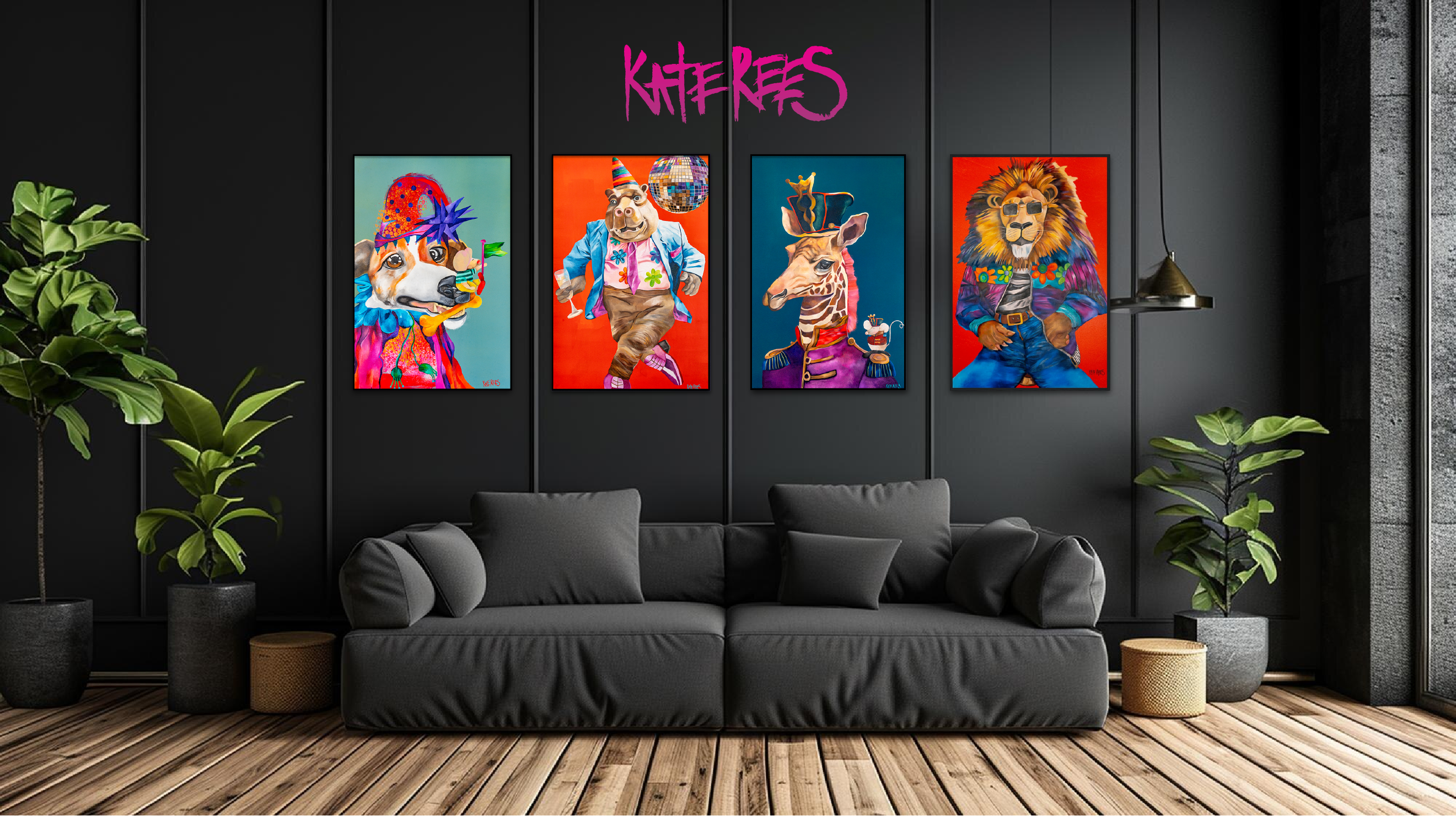 Kate Rees’s custom party animal portraits transform personality into paint, creating one-of-a-kind animal characters that capture the quirks, style, and spirit of the person they represent.